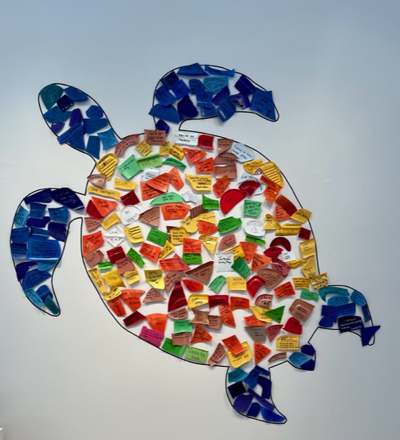 The Grimshaw-Gudewicz Gallery at Bristol community college invited my Elemental Artist Collective to exhibit. Instead of Scrappy, I chose a turtle form since almost everyone has seen the photograph of the sea turtle trapped in a plastic bottle yoke.